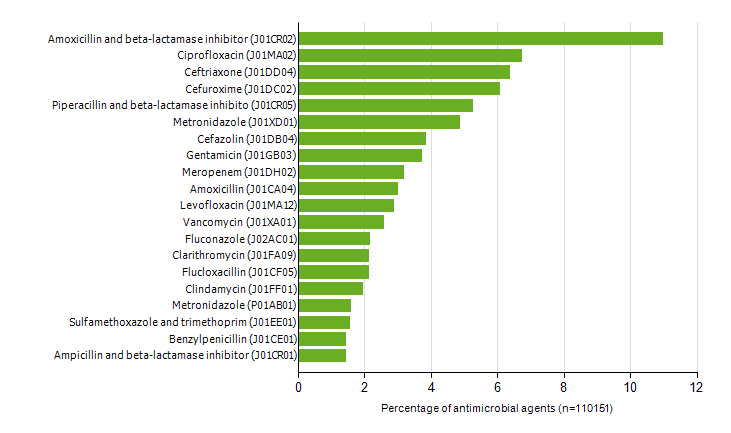 | Most frequently used antimicrobial agents in long-term care facilities in EU/EEA, all indications, all diagnosis sites, selected LTCF types, HALT point prevalence survey, 2016-2017 |
