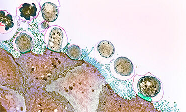 In humans, the infection can be without any symptoms, however, healthy individuals often develop a diarrhoea that spontaneously resolves over a couple of weeks. By contrast, patients with impaired immune system may develop profuse, life-threatening, watery diarrhoea that is very difficult to treat with currently available drugs.