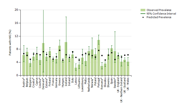 | | | | | | Observed prevalence of HAIs with 95% confidence intervals and predicted prevalence of HAI in acute care hospitals based on patient case-mix and hospital characteristics, by country, ECDC PPS 2011-2012 |