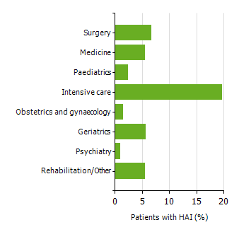| | | | | | | | | | | | | | Prevalence of HAIs and antimicrobial use in acute care hospitals by specialty in EU/EEA, ECDC PPS 2011-2012 (n=231459 patients) |