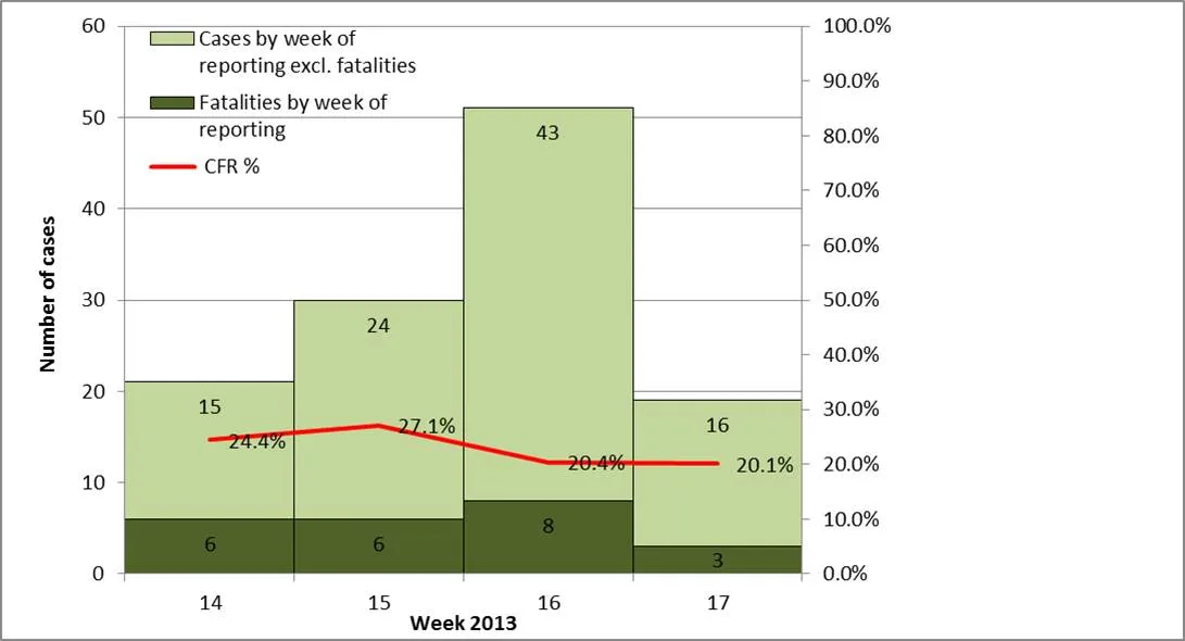Figure 2. Distribution of influenza A(H7N9) cases by week of reporting, as of 29 April 2013 (cases (incl. fatalities)=121, fatalities=23, CFR=19%)
