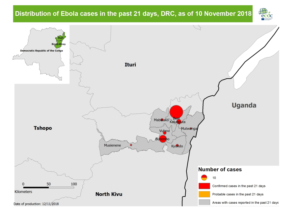 Since May 2018 and as of 10 November 2018, there have been 329 Ebola virus disease cases (294 confirmed, 35 probable), including 205 deaths (170 of which were confirmed cases).