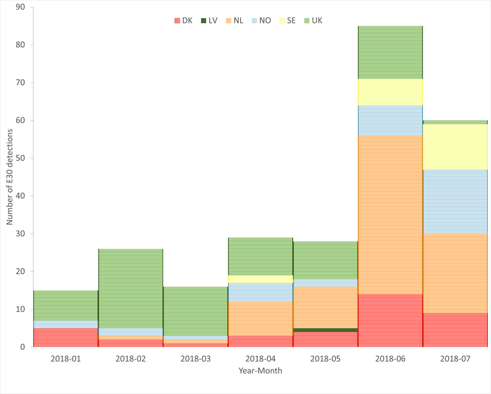 ECDC has compared the available E30 reports from nine Member States in response to a data call through the Epidemic Intelligence Information System–Vaccine Preventable Diseases (EPIS-VPD) platform to earlier collected country-specific E30 detection data from 2015 to 2017. Based on available preliminary data, 259 E30 detections from Denmark (38), Latvia (1), the Netherlands (85), Norway (37), Sweden (21) and the United Kingdom (England and Scotland; 77) were reported since the beginning of 2018 (Figure). An increase was observed in reports from the United Kingdom in February and in Denmark, the Netherlands, Norway and Sweden in June 2018, with the Netherlands reporting higher numbers of E30 infections than previous years. Denmark reported that 23 out of their 38 E30 detections (61%) were from cerebrospinal fluid specimens, which can be used as a proxy for severe infection. In total, 149 out of 167 patients (89%) were reported with central nervous system symptoms from the Netherlands, Norway and the United Kingdom. Of those, 27 were reported with meningitis, 26 encephalitis/meningitis and one patient with sepsis, fever, tachycardia and groaning respiration. For others, the specific symptoms were unknown. Until now, the epidemic has affected mostly infants 0-3 months old (22%) and 26-45-year-olds (38%). With the available preliminary data, the male to female ratio was 1.27.