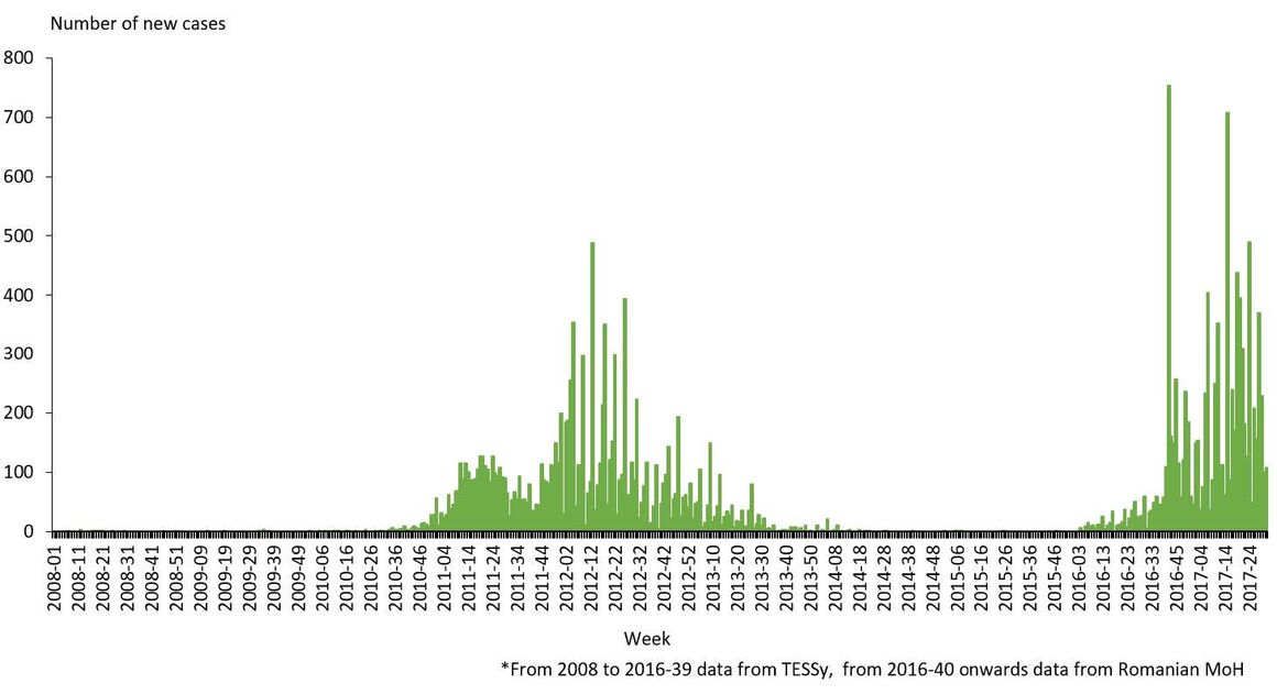 Romania has reported 108 cases since 4 August 2017. Since 1 January 2016 and as of 4 August 2017, Romania reported 8 455 cases, including 32 deaths. Of these, 1 969 cases were reported during 2016, and 6 486 cases were reported in 2017.
