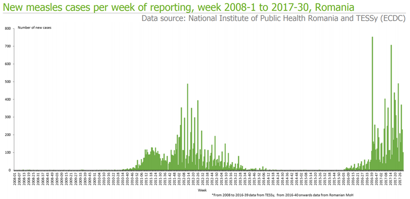Romania and Italy have been experiencing large outbreaks of measles in 2017. Cases continue to be reported despite ongoing response measures (reinforced vaccination activities) at the national level. All EU/EEA countries have reported measles cases this year, except for Latvia, Liechtenstein, Malta and Norway.