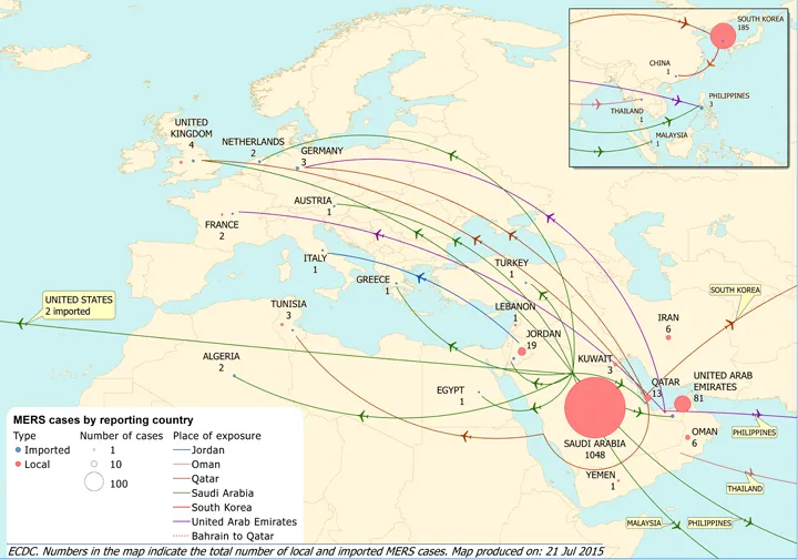 Since the previous update of the ECDC Rapid Risk Assessment on MERS-CoV (30 June 2015), 13 new cases and seven deaths have been reported globally from South Korea (4 cases and 4 deaths), Saudi Arabia (8 cases and 3 deaths) and the Philippines who reported a travel-related MERS case related to travel in the Middle East on 6 July 2015.