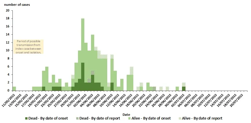 The index case in the South Korean outbreak had onset of symptoms on 11 May and was diagnosed and isolated on 20 May 2015. During the 10-day period from onset of illness until isolation (Figure 3, yellow box), the index case visited several healthcare facilities. According to local health authorities, The Samsung medical hospital was released from quarantine on 20 July 2015 as all the conditions for infection control had been met. This was the last hospital out of 15 affected hospitals freed from quarantine.