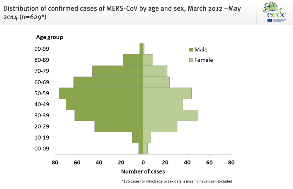 As of 4 June 2014, overall, the case-fatality-ratio is 38%. Of the 629 cases the male to female ratio is 1.7:1. The majority of the cases 275 (44%) are among men older than 40 years.