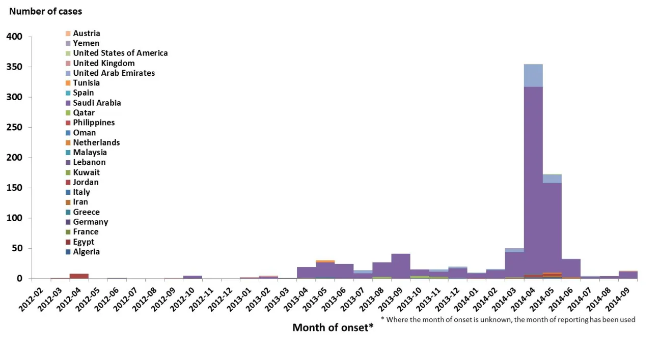Since the last ECDC rapid risk assessment of 21 August and as of 30 September 2014, 31 additional cases have been reported in Saudi Arabia. Of these 31, 19 are retrospective cases with date of onset prior to 3 June 2014 reported on 18 September 2014.Overall, 887 laboratory-confirmed cases of MERS-CoV have been reported to public health authorities worldwide, including 352 deaths (Figure 1). Most of the cases have occurred in the Middle East (Saudi Arabia, United Arab Emirates, Qatar, Jordan, Oman, Kuwait, Egypt, Yemen, Lebanon and Iran) (Table 1). All cases reported outside of the Middle East have had recent travel history to the Middle East or contact with a case who had travelled from the Middle East (Figure 2).
