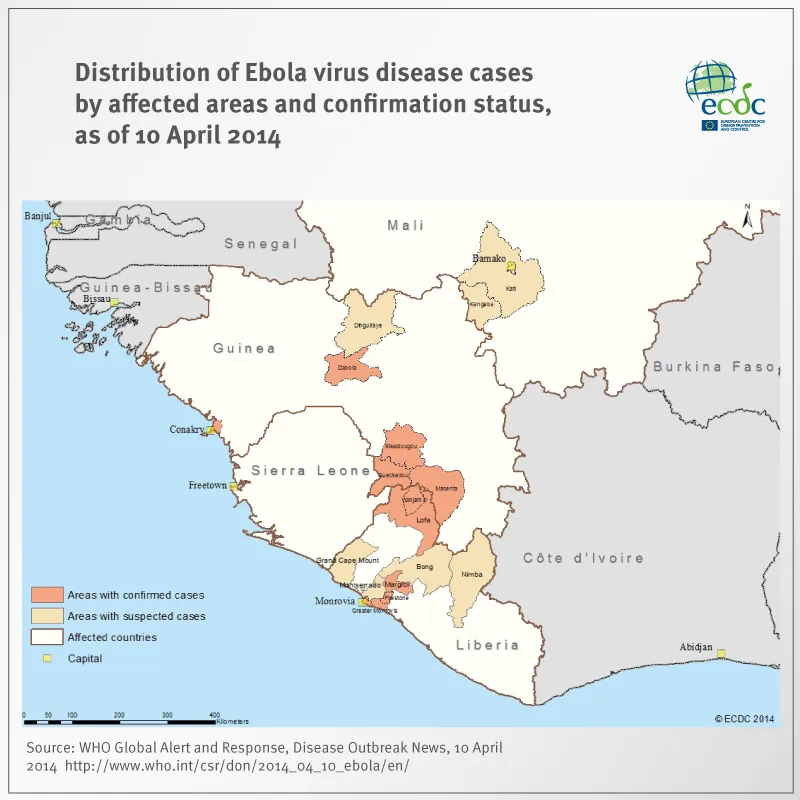 There are no suspected or confirmed cases reported in other West African countries.No cases have been detected in returning travellers in Europe.Control activities supported by WHO, UNICEF, Médecins Sans Frontières and other stakeholders are being implemented, including contact tracing, enhanced surveillance and strengthening of infection control practices, free-of-charge access to healthcare for suspected cases, case isolation and management, and social mobilisation. Information and education materials have been developed and distributed, intensive multimedia communications are underway and psychosocial support is being provided to patients, their families and the affected communities. There is ongoing training for carers in safe practices and for members of local communities in safe burials. A team of EU scientists have set up a field laboratory to test suspect cases, working alongside Médecins Sans Frontières at an isolation centre near the borders with Sierra Leone and Liberia.