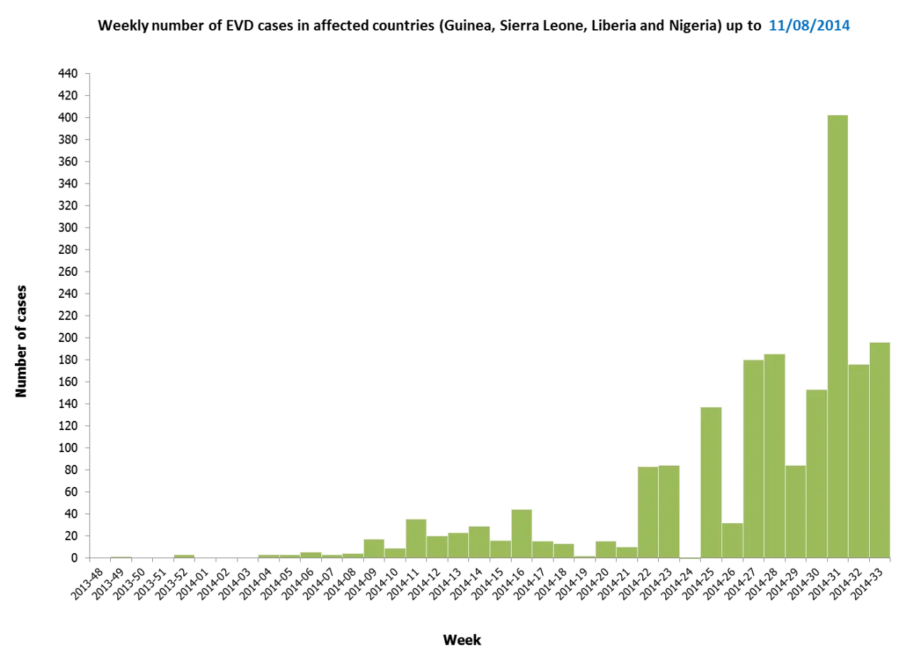 Figure 1: Weekly number of EVD cases in West Africa (Guinea, Sierra Leone, Liberia and Nigeria) from start of the outbreak to 11/08/2014*