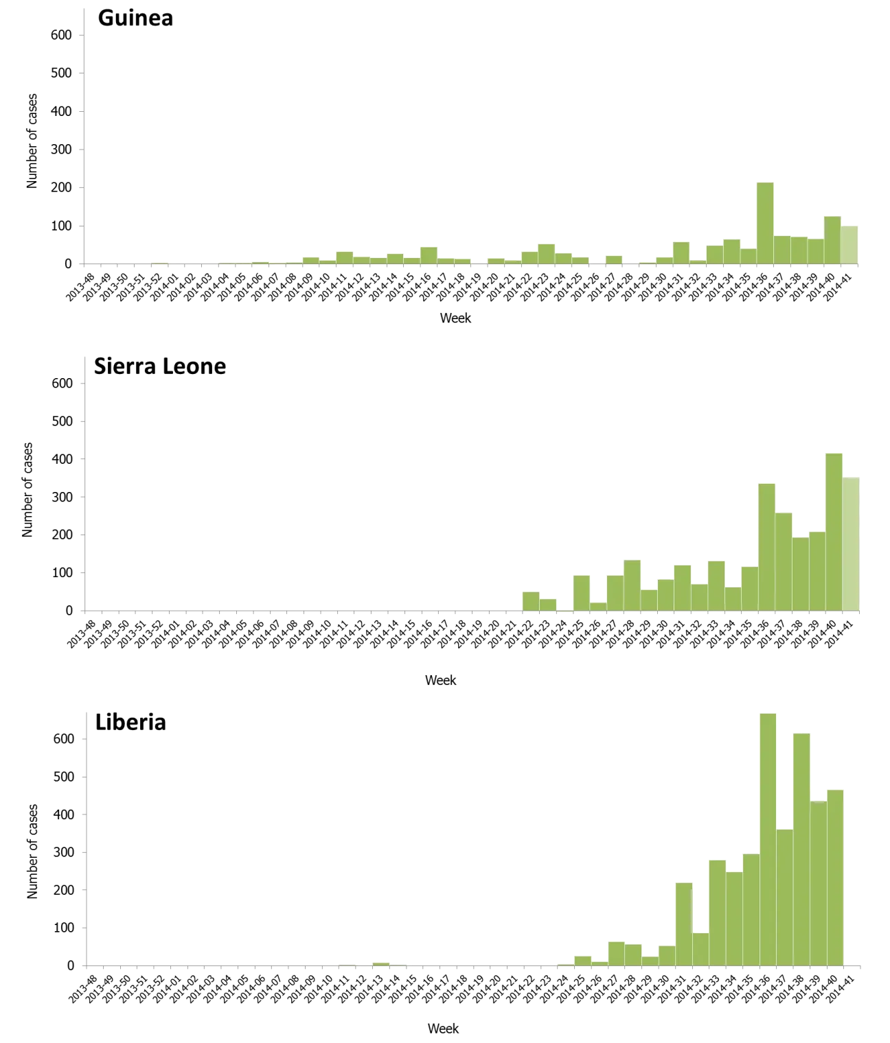 * The bar for week 41/2014 does not represent a complete calendar week. Source: Data are based on official information reported by Ministries of Health up to the end of 5 October for Guinea and Sierra Leone, and 4 October for Liberia. [10]