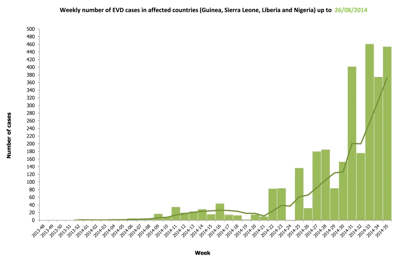 Since December 2013 and as of 26 August 2014, 3 071 cases of EVD, including 1 553 deaths have been reported by WHO. This is the first outbreak of EVD in West Africa and it is unprecedented in its size and geographical distribution, and in affecting densely populated urban areas. The outbreak is currently in a rapid increase phase and has not yet peaked (Figure 1). Officially reported figures are generally believed to be under-estimations of the real magnitude of this outbreak.
