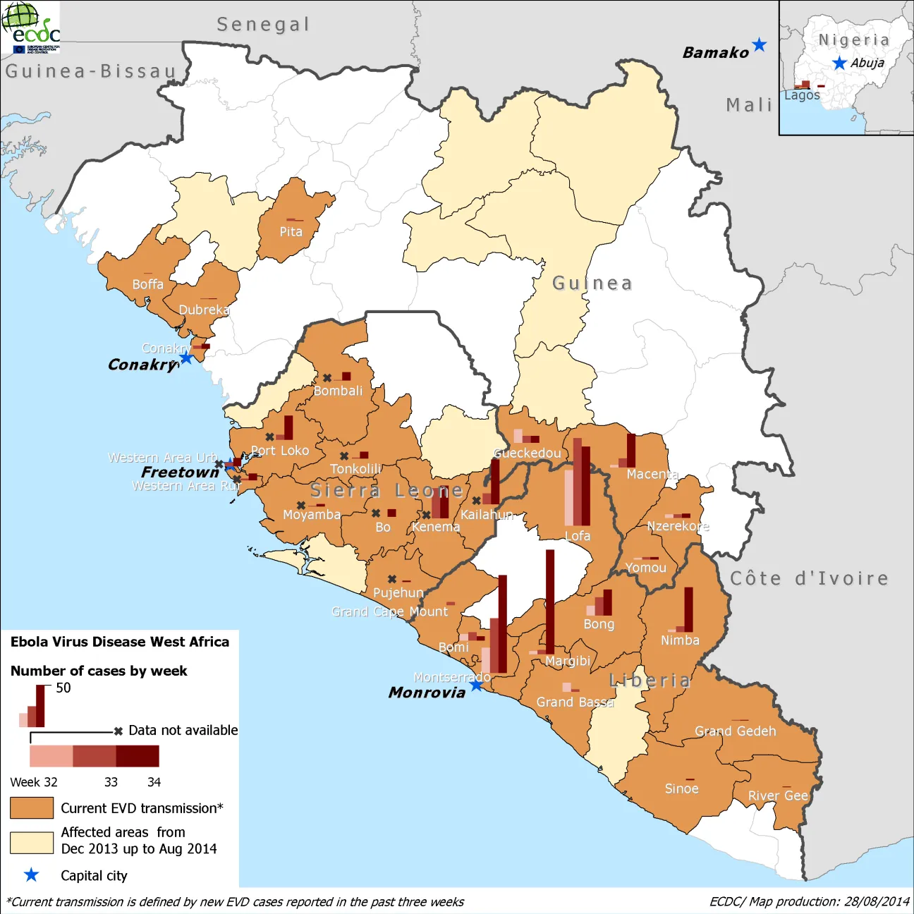 Epidemiological update: Outbreak of Ebola virus disease in west Africa and Democratic Republic of the Congo, 28 August 2014