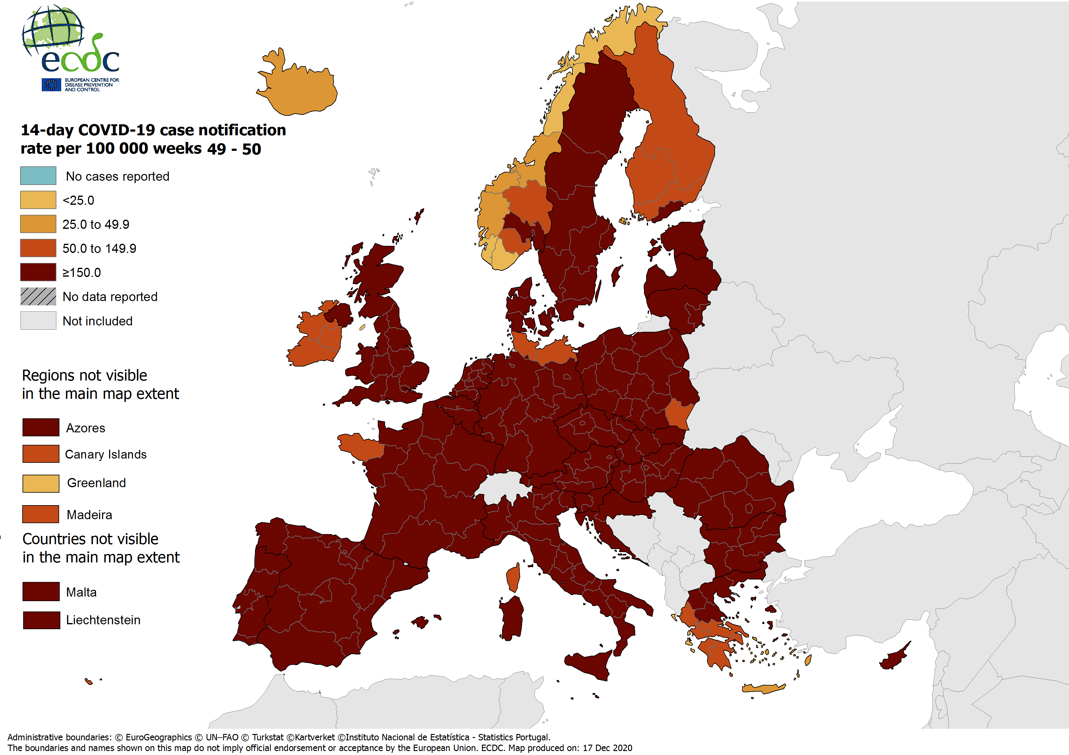 14-day case notification rate per 100 000 inhabitants, updated 17 December 2020, week 49-50