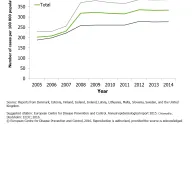 Between 2005 and 2014, 3 291 545 cases of chlamydia infection were reported from 27 countries. The completeness of reported data improved over time as surveillance systems were further developed in several countries during this period. The overall notification rate among countries with comprehensive surveillance systems increased from 165 cases per 100 000 in 2005 to 189 in 2009. Since then, the overall rate has remained relatively stable. Changes in notification rates are affected by the increasing number of countries that reported data over the years. The overall rate among countries which reported consistently between 2005 and 2014 (Denmark, Estonia, Finland, Iceland, Ireland, Latvia, Lithuania, Malta, Slovenia, Sweden and the United Kingdom) increased by 65% (from 202 to 333 cases per 100 000 population). Throughout this time period, rates among women have been consistently higher than among men, reflecting testing policies and practices across Europe (Figure 4). Although the notification rate increased only moderately (5%) between 2010 and 2014, country specific trends varied: some countries with lower chlamydia notification rates reported increases of over 50% in their rates (Bulgaria, Latvia, Slovakia, Slovenia); the countries with the highest chlamydia notification rates reported stable trends (Denmark, Finland, Norway, Sweden, United Kingdom); countries with low chlamydia notification rates reported decreasing trends (Greece, Iceland, Malta, Poland, Romania). Iceland, which until 2013 reported the highest rate in the EU/EEA, also reported a decrease.