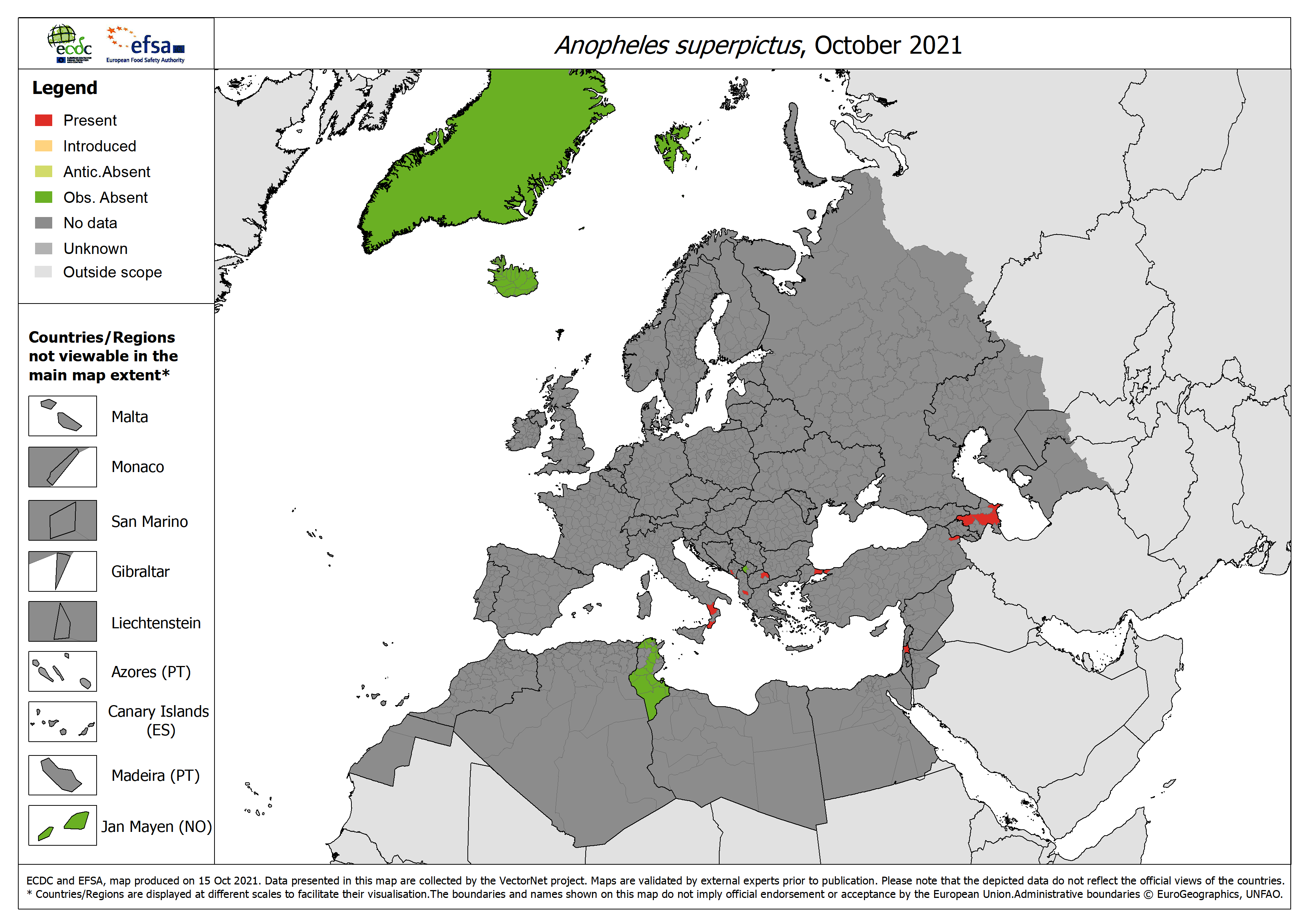 The map shows the current known distribution of Anopheles superpictus in Europe at ‘regional’ administrative level, as of October 2021. 0 new reports were submitted since the previous update (March 2021).