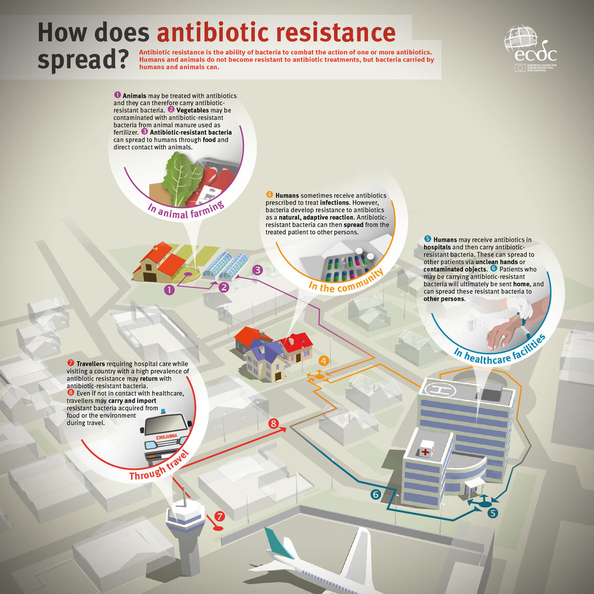 This infographic explains how antibiotic resistance spreads in animal farming, in the community, in healthcare facilities and through travel.
