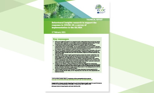This Technical Report presents evidence about the current status of Behavioural Insights (BI) research being conducted in the ten EU/EEA Member States that responded to an ECDC survey, within the context of the COVID-19 pandemic. The focus is on identifying experiences, challenges, and key lessons learned in translating the findings from BI research into effective strategies for pandemic response, and for optimising risk communication activities. The work has been undertaken in the context of concern about sub-optimal compliance in some Member States to the non-pharmaceutical measures that are in place to reduce the spread of the SARS-CoV-2, and also with regards to the need to support the implementation of national COVID-19 vaccination programmes.