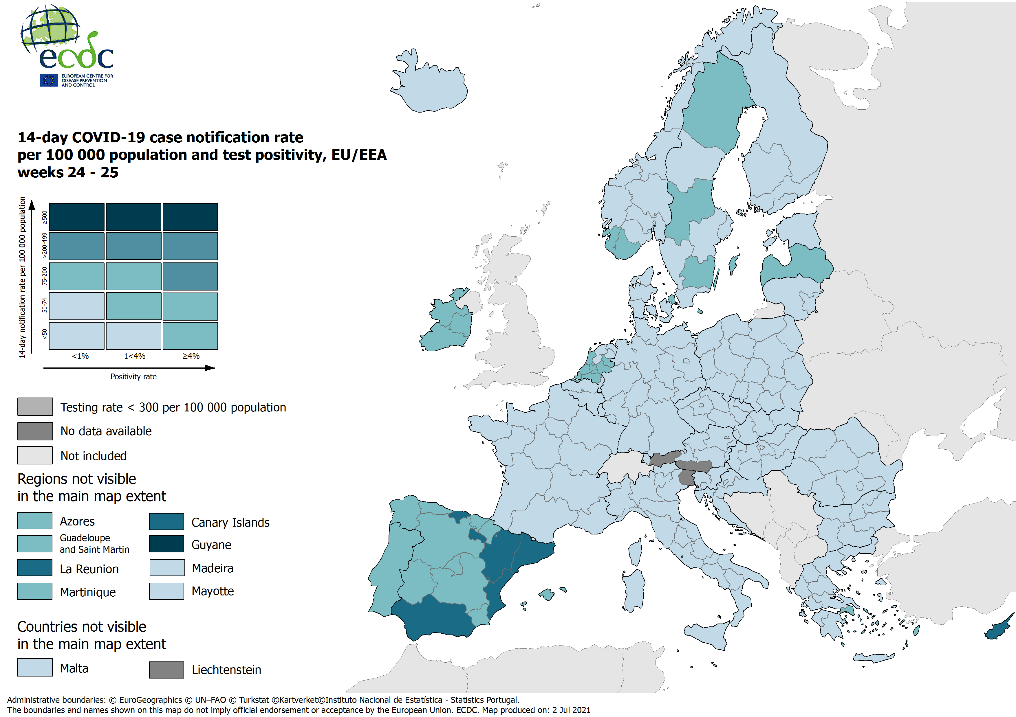 Combined indicator: 14-day notification rate, testing rate and test positivity, updated 2 July 2021, week 25 (colour-blind friendly)