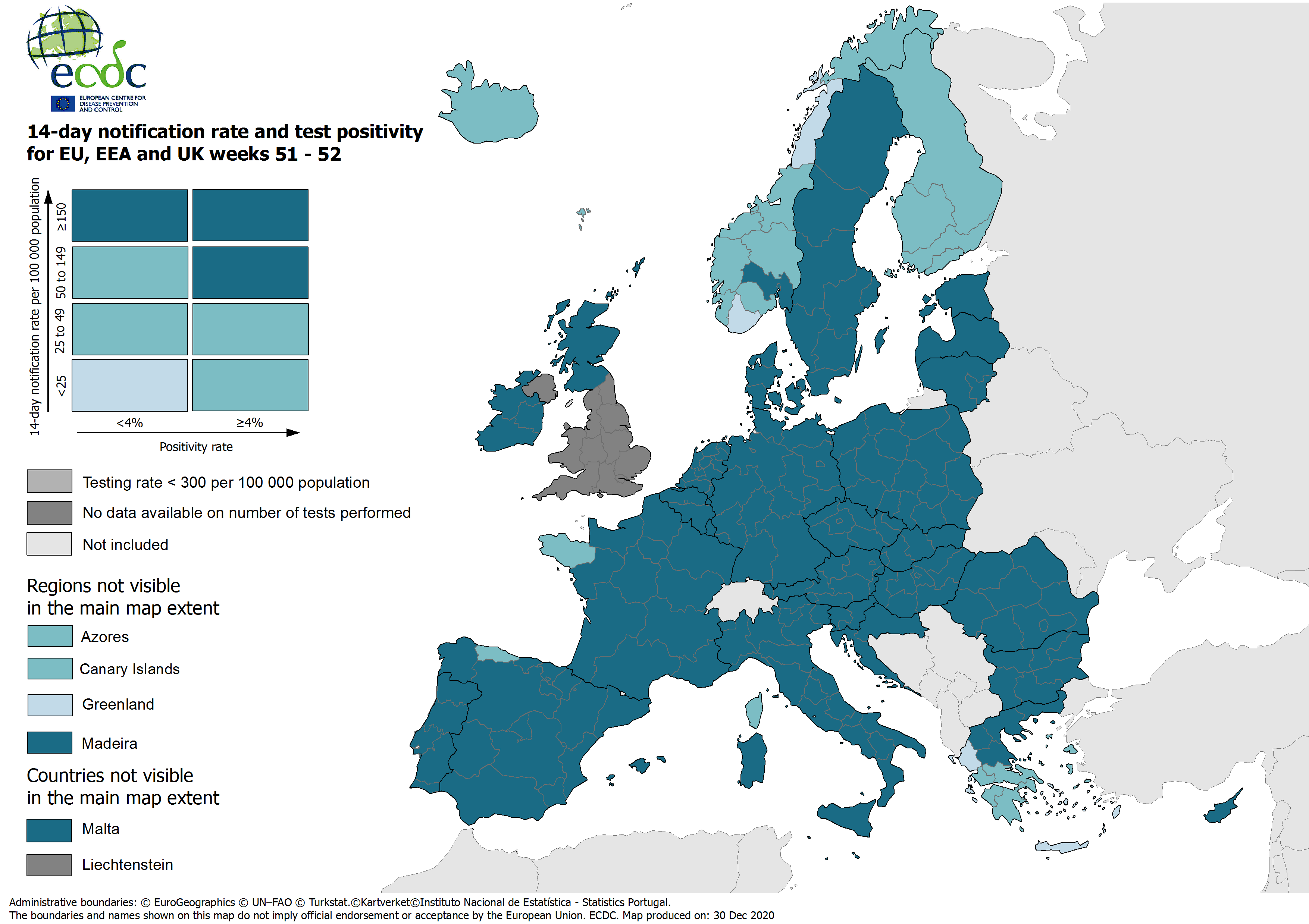 Combined indicator: 14-day notification rate, testing rate and test positivity, updated 30 December 2020, week 52 (colour-blind friendly)