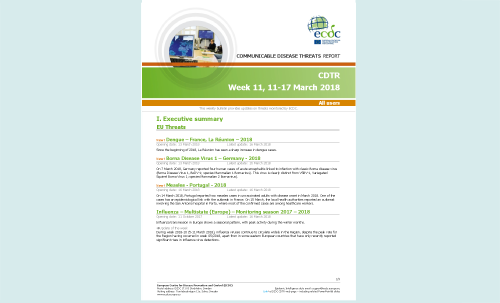 The ECDC Communicable Disease Threats Report (CDTR) is a weekly bulletin for epidemiologists and health professionals on active public health threats. This issue covers the period 11-17 March 2018 and includes updates on seasonal influenza, dengue, measles, Borna diseas virus, hepatitis A, Lassa fever, yellow fever and malaria.