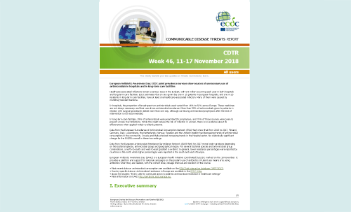 The ECDC Communicable Disease Threats Report (CDTR) is a weekly bulletin for epidemiologists and health professionals on active public health threats. This issue covers the period from 11-17 November 2018 and includes updates on West Nile virus, Ebola virus disease and influenza.