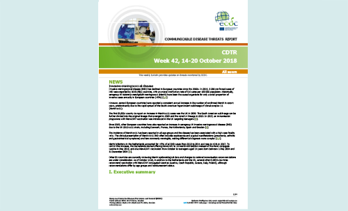 The ECDC Communicable Disease Threats Report (CDTR) is a weekly bulletin for epidemiologists and health professionals on active public health threats. This issue covers the period from 14-20 October 2018 and includes updates on chikungunya and dengue, West Nile virus, Ebola virus disease, influenza, and autochthonous dengue in France and Spain.