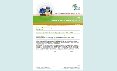 The ECDC Communicable Disease Threats Report (CDTR) is a weekly bulletin for epidemiologists and health professionals on active public health threats. This issue covers the period 18-24 February 2018 and includes updates on cholera, influenza, dengue, chikungunya, Zika virus, Hepatits A and yellow fever.