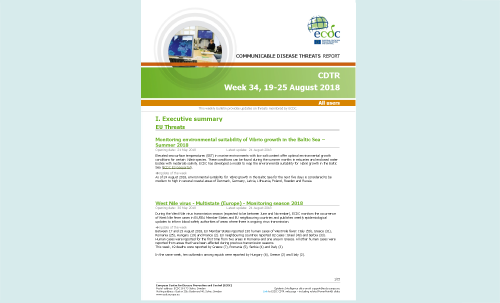 The ECDC Communicable Disease Threats Report (CDTR) is a weekly bulletin for epidemiologists and health professionals on active public health threats. This issue covers the period 19-25 August 2018 and includes updates on dengue, chikungunya, Vibrio growth in the Baltic Sea, West Nile virus, Ebola virus disease, MERS-CoV, cholera.
