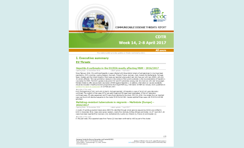 The ECDC Communicable Disease Threats Report (CDTR) is a weekly bulletin for epidemiologists and health professionals on active public health threats. This issue covers the period 2–8 April 2017 and includes updates on influenza, MDR TB and Measles.