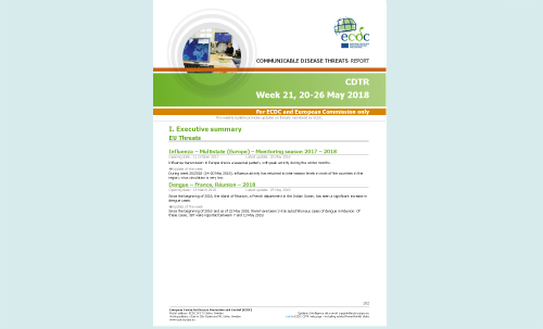 The ECDC Communicable Disease Threats Report (CDTR) is a weekly bulletin for epidemiologists and health professionals on active public health threats. This issue covers the period 20-26 May 2018 and includes updates on chikungunya, dengue, Ebola virus disease, seasonal influenza, and yellow fever.