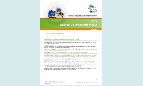 The ECDC Communicable Disease Threats Report (CDTR) is a weekly bulletin for epidemiologists and health professionals on active public health threats. This issue covers the period 23-29 September 2018 and includes updates on chikungunya and dengue, West Nile virus, Ebola virus disease and monkeypox.