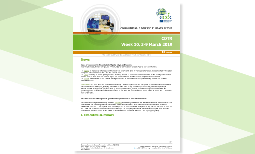 The ECDC Communicable Disease Threats Report (CDTR) is a weekly bulletin for epidemiologists and health professionals on active public health threats. This issue covers the period from 3-9 March 2019 and includes updates on Leishmaniasis and Zika virus disease, Middle East respiratory syndrome coronavirus (MERS-CoV), measles, Ebola virus disease, influenza, Rift Valley fever and mass gathering for Carnival in Brazil.