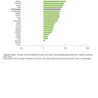 Syphilis male-to-female ratio in 27 EU/EEA countries, 2014