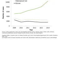 Number of reported confirmed syphilis cases by gender and transmission category, EU/EEA countries reporting consistently, EU/EEA, 2009−2014