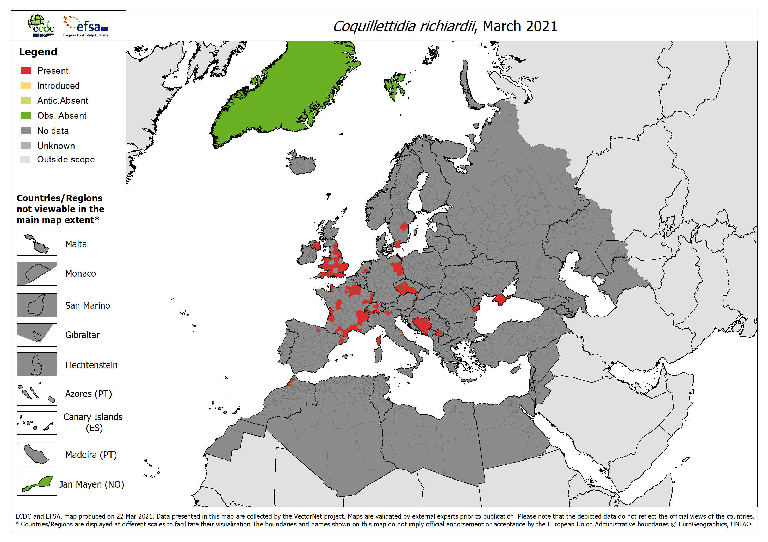 The map shows the current known distribution of Coquillettidia richiardii in Europe at ‘regional’ administrative level, as of March 2021. 209 new reports were submitted since the previous update (October 2020).