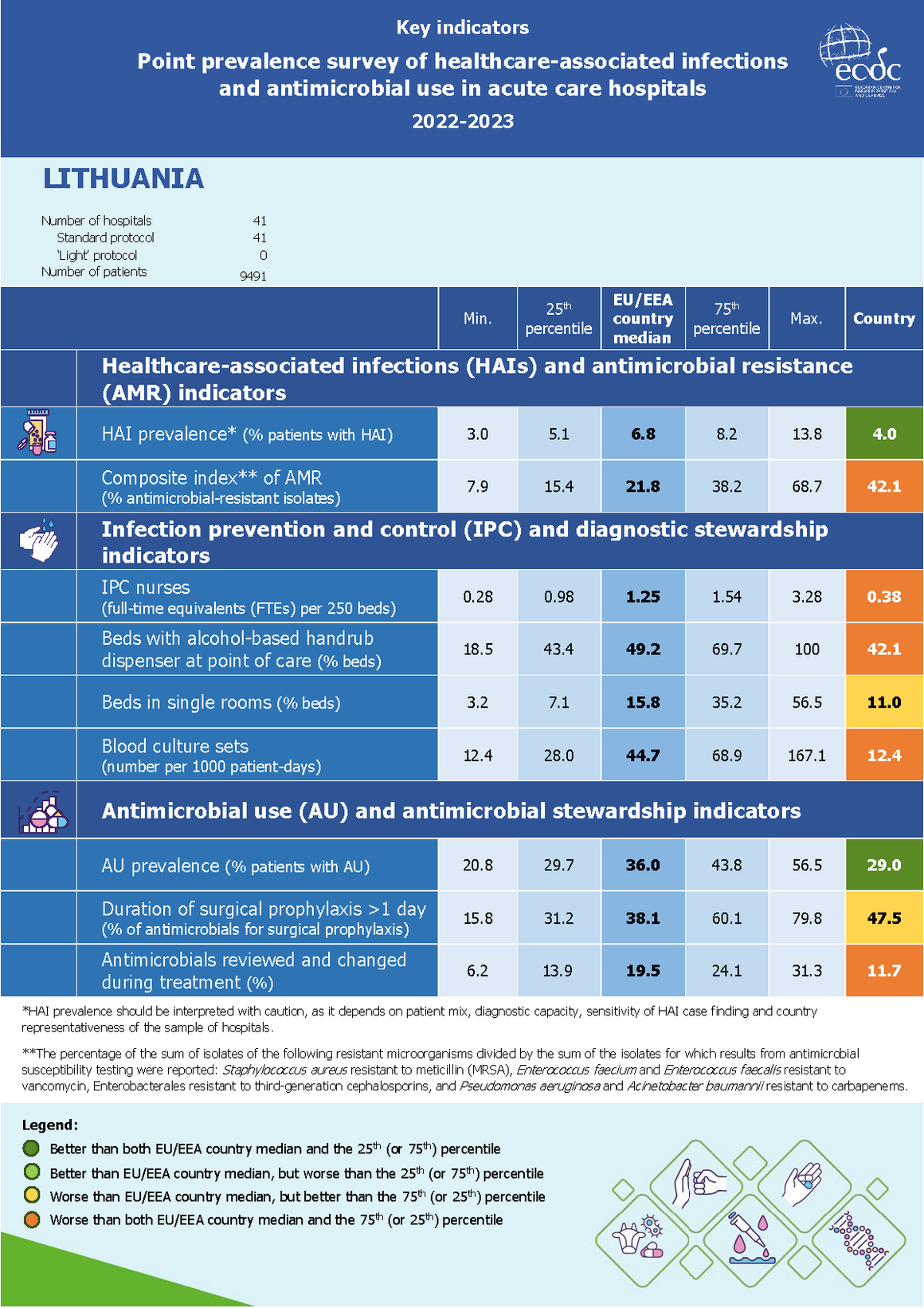 Infographic showing the key indicators of the point prevalence survey of healthcare-associated infections and antimicrobial use in European acute care hospitals – 2022-2023.