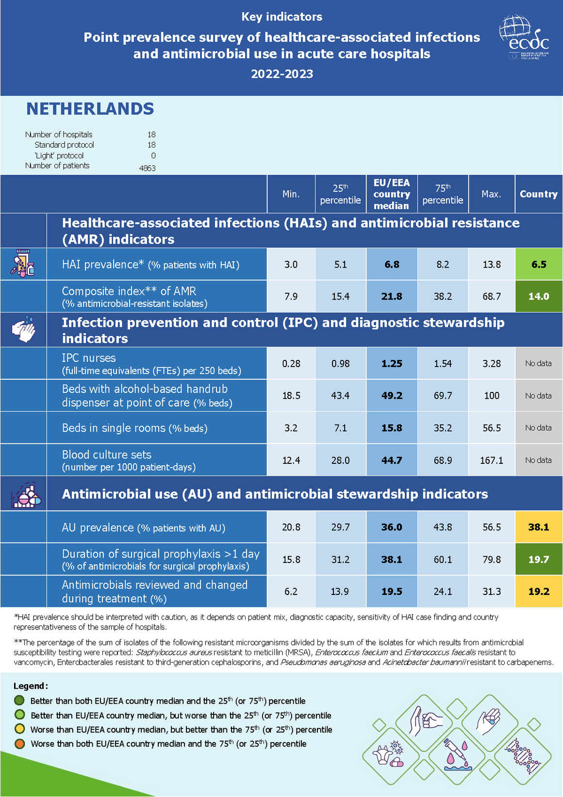Infographic showing the key indicators of the point prevalence survey of healthcare-associated infections and antimicrobial use in European acute care hospitals – 2022-2023.