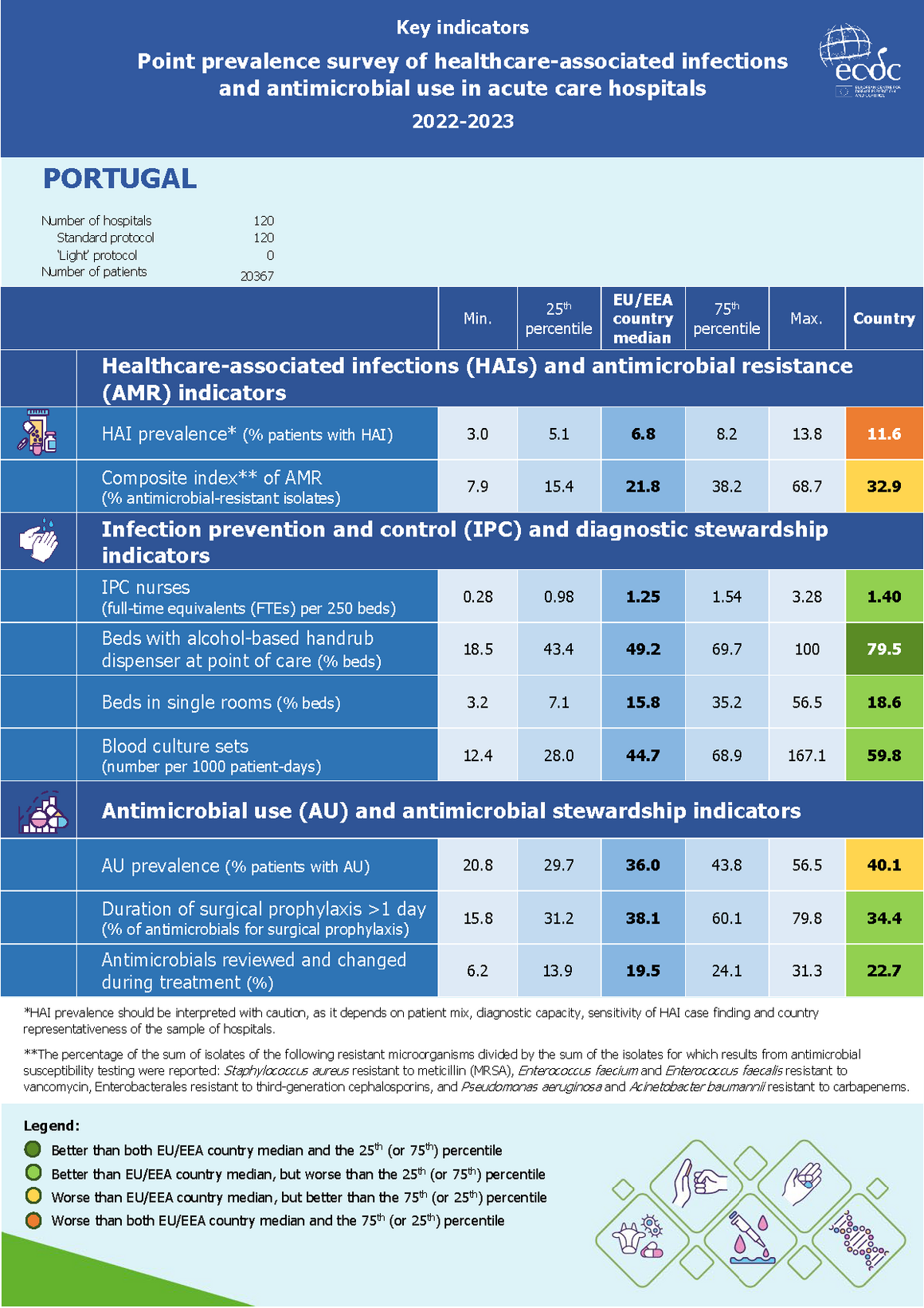 Infographic showing the key indicators of the point prevalence survey of healthcare-associated infections and antimicrobial use in European acute care hospitals – 2022-2023.