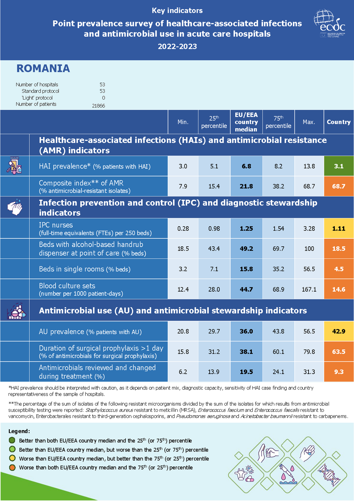 Infographic showing the key indicators of the point prevalence survey of healthcare-associated infections and antimicrobial use in European acute care hospitals – 2022-2023.