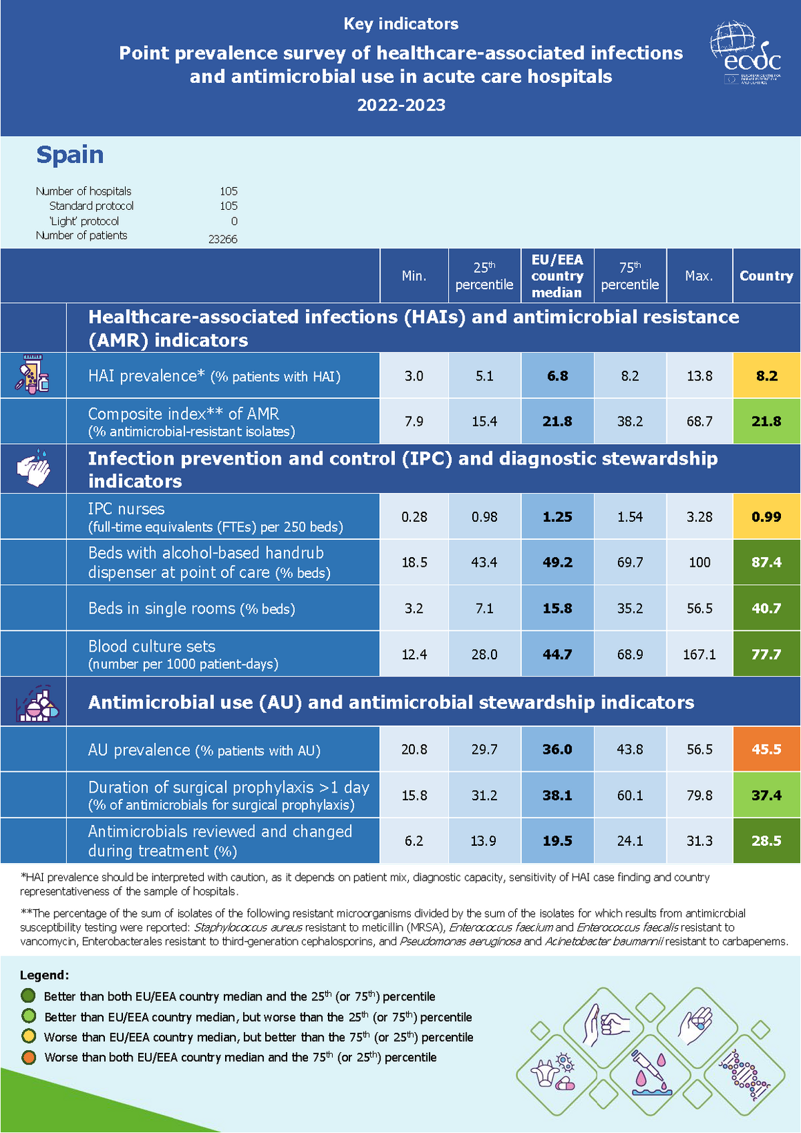 Infographic showing the key indicators of the point prevalence survey of healthcare-associated infections and antimicrobial use in European acute care hospitals – 2022-2023.