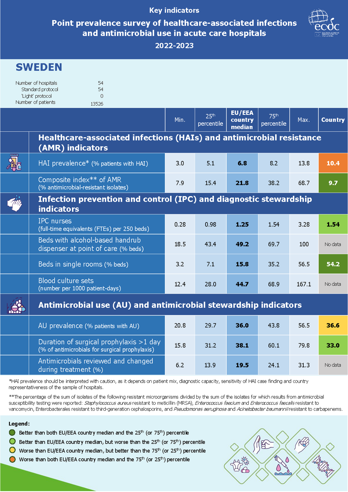 Infographic showing the key indicators of the point prevalence survey of healthcare-associated infections and antimicrobial use in European acute care hospitals – 2022-2023.
