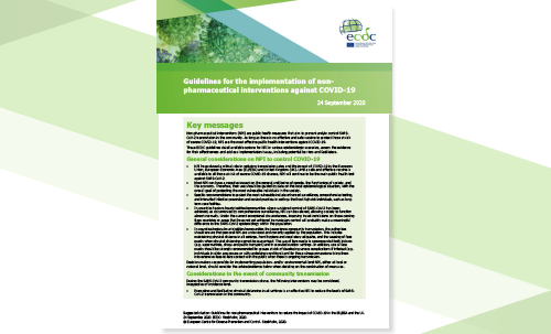 Non-pharmaceutical interventions (NPI) are public health measures that aim to prevent and/or control SARS-CoV-2 transmission in the community. After vaccination, NPIs are the most effective public health interventions against COVID-19. These ECDC guidelines detail available options for NPIs in various epidemiologic scenarios, assess the evidence for their effectiveness and address implementation issues, including potential barriers and facilitators. Further ECDC guidance related to the use of NPIs can be found in the below list. These can be of support when looking to tailor NPIs to the epidemiological situation as well as level of vaccination coverage in a population.