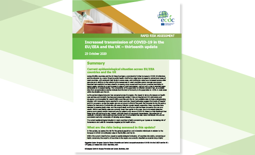 Across the European Union/European Economic Area (EU/EEA) and the United Kingdom (UK) there has been a considerable further increase in COVID-19 infections and the current situation represents a major threat to public health. In most countries, notification rates have increased in certain regions, with extremely high levels in some areas. Moreover, in addition to the substantial increases seen in most countries among younger age groups, notification rates have also increased in older age groups. Reported test positivity has been steadily increasing since August and has shown a marked escalation in recent weeks, pointing to a real increase in rates of viral transmission, rather than just a rise in reported cases attributable to increased testing. Vulnerability to infection remains high, as available data from seroprevalence studies indicate that the level of immunity in the population is <15% in most areas of the EU/EEA and the UK.