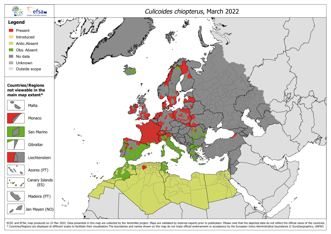 Suggested citation: European Centre for Disease Prevention and Control and European Food Safety Authority. Biting-midge maps [internet]. Stockholm: ECDC; 2022. Available from: https://ecdc.europa.eu/en/disease-vectors/surveillance-and-disease-data/biting-midge-maps