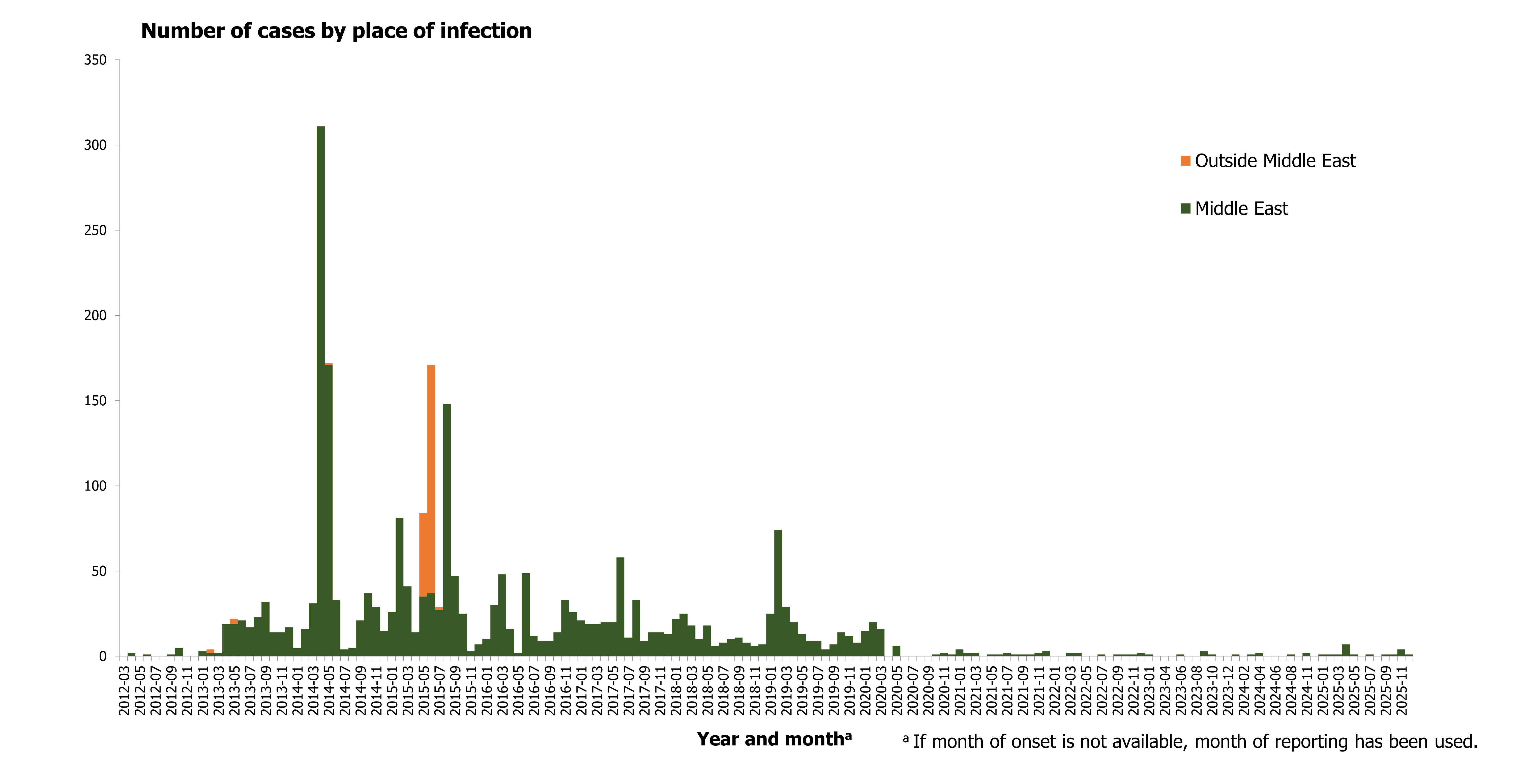 Distribution of confirmed cases of MERS by place of infection and month of onset, April 2012 – December 2025