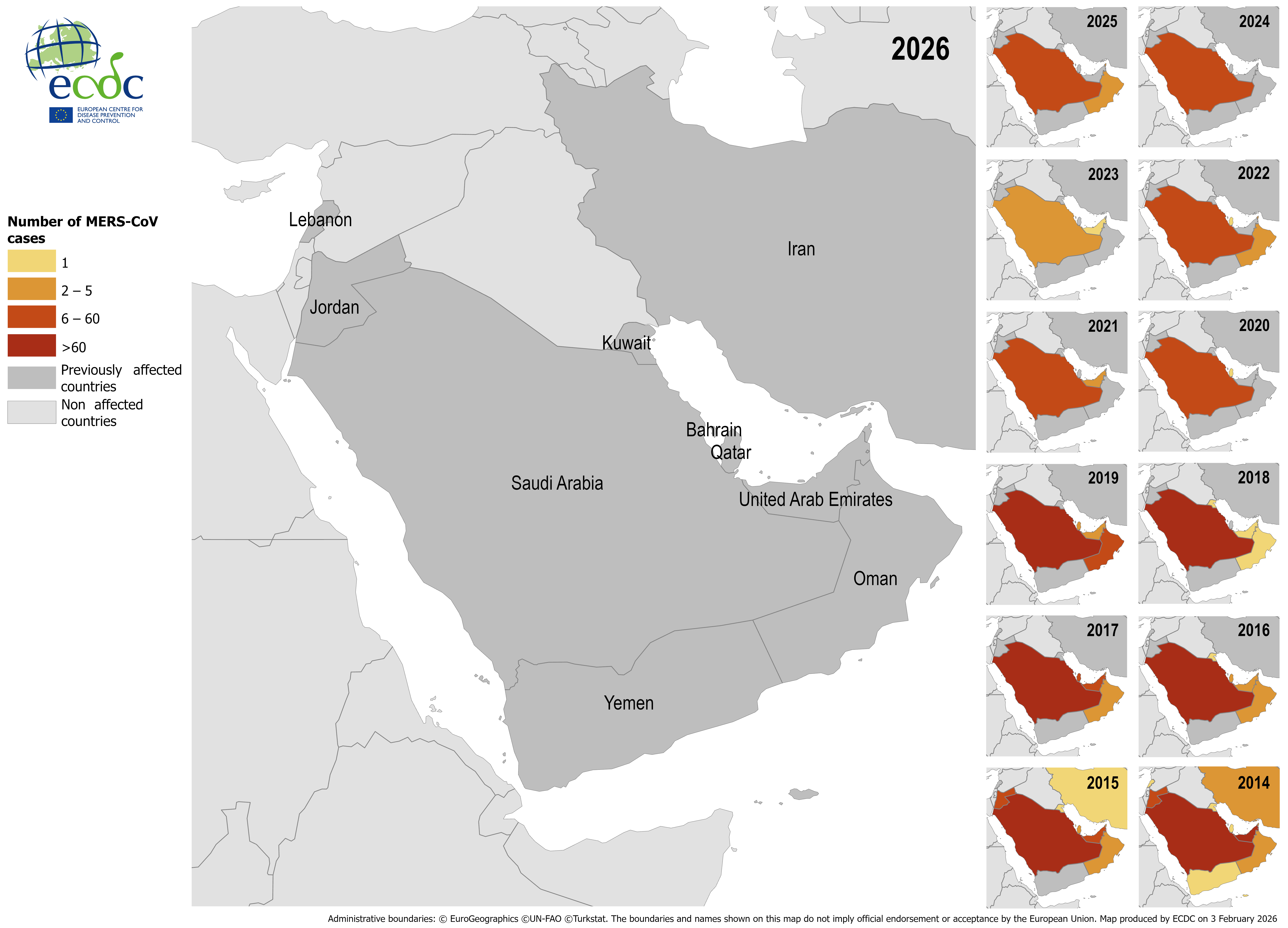 Since the previous update on 5 January 2026, and as of 3 February 2026, no new MERS cases have been reported by the World Health Organization (WHO) or national health authorities.