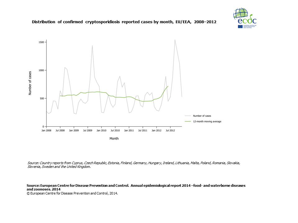 Distribution of confirmed cryptosporidiosis reported cases by month, EU/EEA, 2008–2012