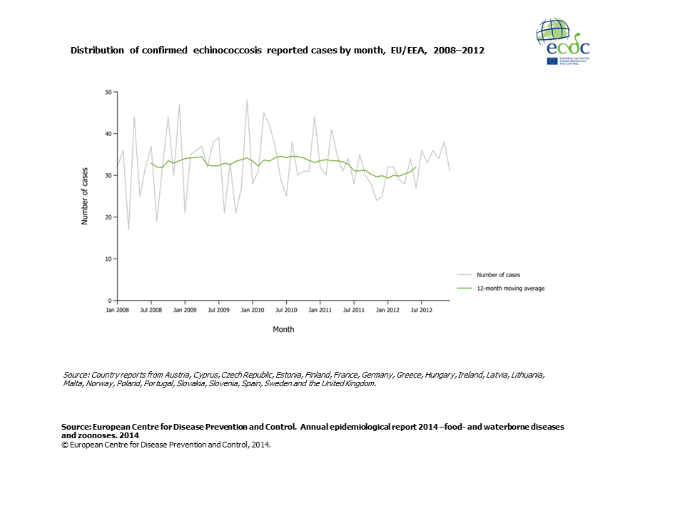 Distribution of confirmed echinococcosis reported cases by month, EU/EEA, 2008–2012